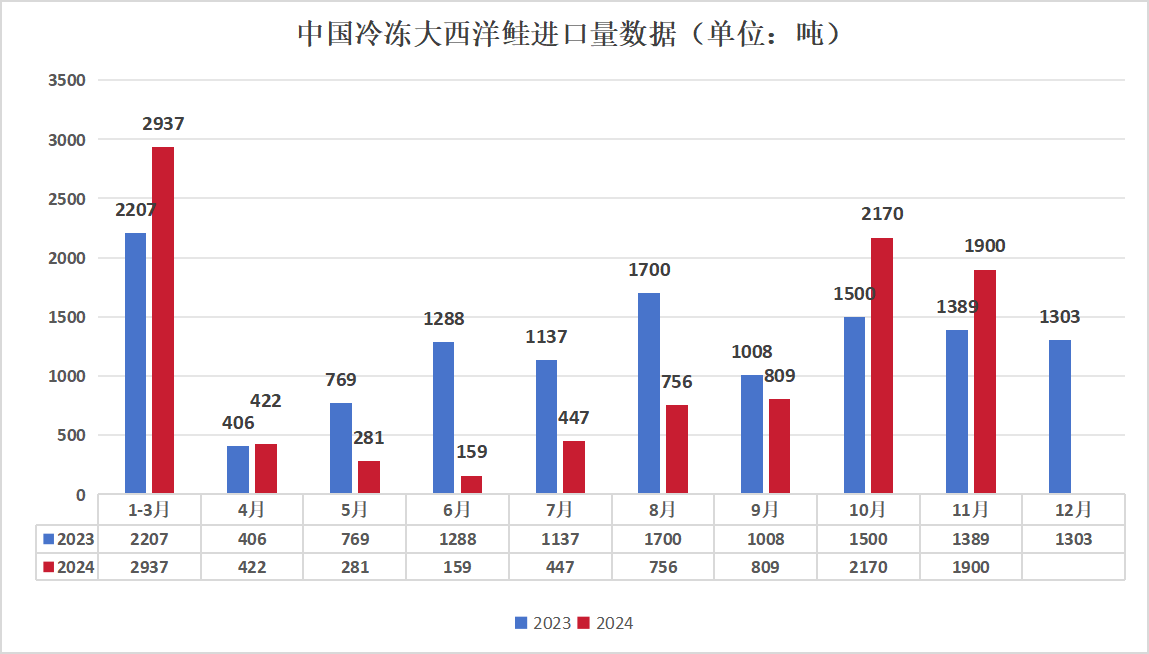 据中国海关最新数据显示,2024年前11月中国已进口9。42万吨大西洋鲑(8。43万吨冰鲜+0。99万吨冷冻)。