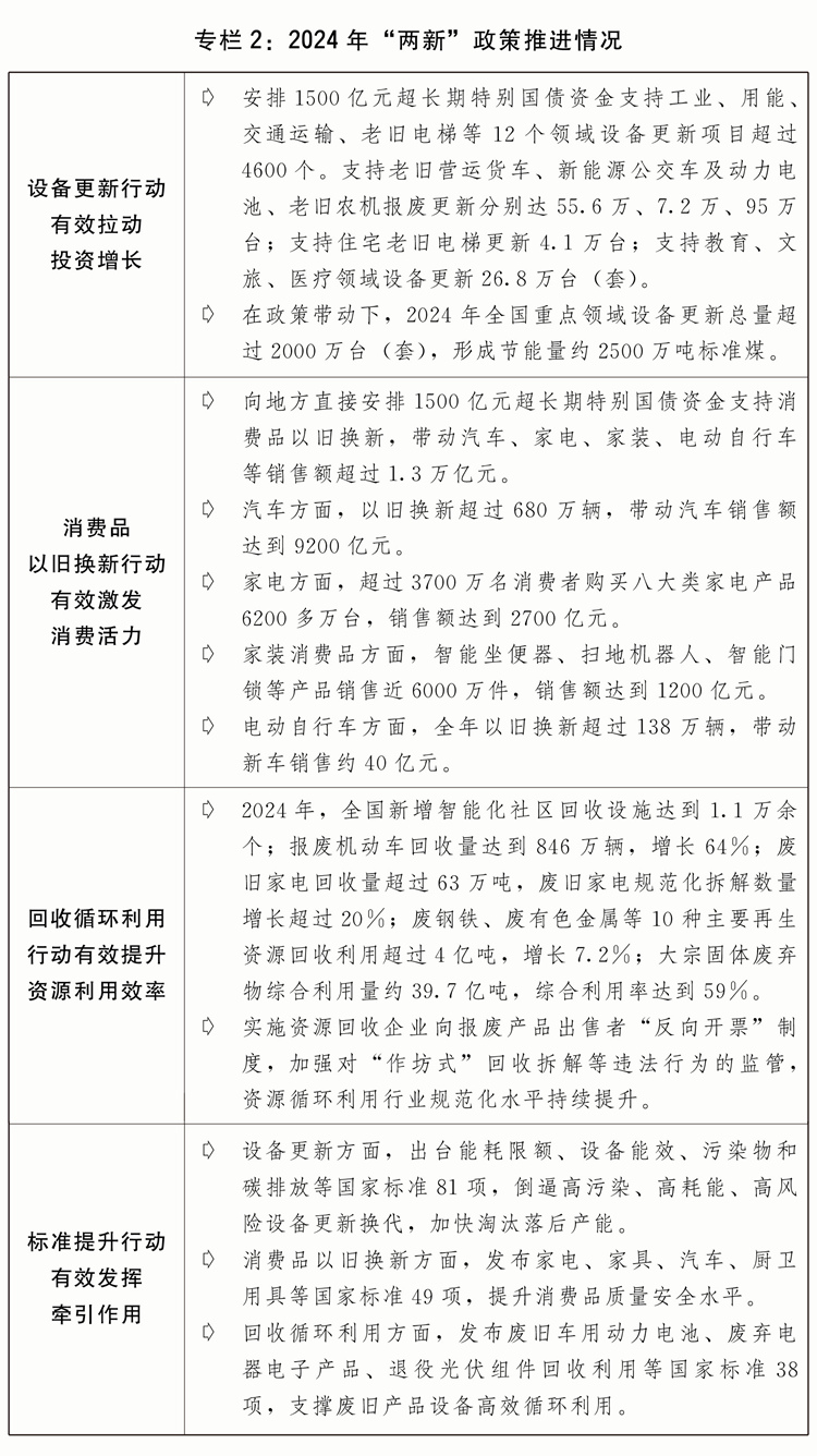 一是科技立异系统持续健全。充实阐扬新型举国体系体例劣势,强化国度计谋科技力量,全面启动实施国度科技严沉专项。国度尝试室系统扶植稳步推进。加速推进严沉科技根本设备系统化扶植,提拔全生命周期办理程度,已有39个设备投入运转。健全企业从导的产学研深度融合系统,鞭策成立企业研发预备金轨制,支撑创业投资高质量成长,培育强大科技领军企业、专精特新中小企业,企业科技立异从体地位不竭强化。二是严沉立异持续出现。“嫦娥六号”正在人类汗青上初次实现月球后背采样前往。“空间地面模仿安拆”建成投用。我国首艘超深水大洋钻探船“胡想”号建成入列。第五座南极调查坐秦岭坐开坐。集成电全财产链焦点手艺加快冲破,鸿蒙操做系统生态兴旺成长。第三代自从超导量子计较机“本源悟空”上线处置器正在量子计较优胜性测试上成立新劣势。正在全球初次发觉引力子激发。水冷磁体手艺打破世界记载,碳基新材料范畴取得原创性冲破。人工智能大模子实现冲破。人形机械人等智能终端新业态加快出现。1000千瓦级平易近用涡轴策动机取得型号及格证,300兆瓦级F级沉型燃气轮机完成初次满负荷试验,全球最大26兆瓦级海优势力发电机组总拆下线。第三代自从产权核电“国和一号”示范工程首堆建成投运。时速450公里的CR450中国尺度高速动车组完成设想制制。全球最大无人货运飞机总拆下线。三是教育科技人才一体推进迈出新程序。完美人才培育取经济社会成长需求适配机制,深化高档教育分析,扩大根本学科和国度环节急需范畴研究生培育规模。制定推进各类立异从体协同联动、立异要素顺畅流动取优化设置装备摆设的政策。深化科技赋权。深切推进科技人才分类评价,加强青年科技人才全链条培育。(四)积极激发消费活力、提高投资效益,内需潜力不竭。全年社会消费品零售总额增加3。5%,固定资产投资(不含农户)增加3。2%,最终消费收入、本钱构成总额对经济增加的贡献率别离为44。5%、25。2%。一是实物消费不变扩大。积极推进住房、汽车、电子产物、家具家拆等大消费。将全国层面贸易性小我住房贷款最低首付比例同一降至15%,打消全国层面贸易性小我住房贷款利率政策下限,降低存量房贷利率和小我住房公积金贷款利率,降低住房买卖、开辟环节的税收承担,四时度全国新房、二手房买卖网签面积环比别离增加21。6%、7。7%。开展新能源汽车促消费勾当,全年汽车销量达3143。6万辆、增加4。5%,此中,新能源汽车销量达1287万辆、增加35。5%,市场拥有率达40。9%。发布升级和立异消费品指南(轻工第十一批)。深切鞭策新能源汽车、绿色建材、绿色智能家电等下乡,村落消费品零售额增加4。3%。曲播带货、立即零售等新业态带动感化持续阐扬,实物商品网上零售额达12。8万亿元、增加6。5%。二是办事消费增加较快。出台推进办事消费高质量成长的看法,完美办事消费支撑政策。全年办事零售额增加6。2%、高于商品零售额增速3个百分点。完美全国年节及留念日放假法子,新增2天节假日。出台推进文化和旅逛消费的支撑政策,冰雪旅逛、研学旅逛、红色旅逛、旅逛列车等,国内出逛人次、居平易近出逛破费别离增加14。8%、17。1%。文娱消费持续增加,体育消费日益升温,马拉松、骑行、户外活动等加快普通化,赛事经济日益成为新增加点。深切实施数字消费提拔步履,通信消息办事类零售额连结两位数增加。印发关于成长银发经济促进老年人福祉的看法,推进老年人康养、文旅等消费潜力。提拔外籍人员入境旅逛领取便当化程度,片面免签国度增至38个,互免签证国度增至26个,将过境免签外国人正在境内逗留时间耽误至240小时,入境旅客1。32亿人次、增加60。8%。三是消费持续优化。开展“消费推进年”等勾当,出力打制消费新场景培育消费新增加点。鞭策老字号守正立异成长,全国中华老字号数量扩围至1455个。因地制宜扶植新消费品牌孵化。深化国际消费核心城市培育扶植,鼎力成长聪慧商圈,累计扶植一刻钟便平易近糊口圈4335个、办事社区居平易近1。07亿人。完美县域农村消费根本设备。出台实施《消费者权益保实施条例》,加强消费范畴监管法律,开展2024年儿童和学生用品平安守护步履。四是投资感化无效阐扬。统筹用好地方预算内投资、处所专项债券、2023年增发国债、超持久出格国债等支撑沉点项目扶植。优化地方预算内投资投向范畴,强化项目监视办理。优化处所专项债券办理机制,实施专项债券投向范畴“负面清单”办理。加强项目谋划储蓄,强化用地、用海、用能、环评等要素保障,加强项目全生命周期办理。鞭策“十四五”规划102项严沉工程取得积极进展。2023年1万亿元增发国债支撑的1。5万个项目加速实施,一多量灾后恢复沉建和防灾减灾救灾能力提拔项目按期建成。五是平易近间投资健康成长。扣除房地产开辟的平易近间投资增加6%,制制业平易近间投资增加10。8%。5个新核准核电项目引入平易近间本钱参股比例达10%。规范实施和社会本钱合做(PPP)新机制。全年依托项目推介平台吸引平易近间本钱参取项目531个、总投资4136亿元。成立全国沉点平易近间投资项目库,持续加强资金和要素支撑。建立根本设备范畴不动产投资信任基金(REITs)常态化刊行轨制系统,累计62个项目刊行上市、发售基金1