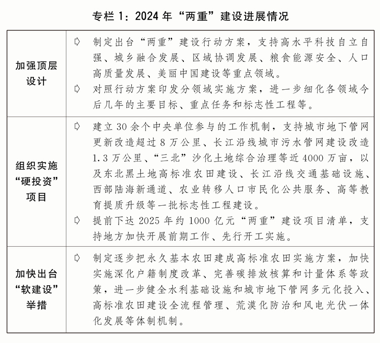 一是宏不雅政策结果持续。聚焦凸起问题,环绕加力提效实施宏不雅政策、扩大国内无效需求、加大帮企帮扶力度、鞭策房地产市场止跌回稳、提振本钱市场等方面,深切贯彻落实一揽子增量政策,打出一套“组合拳”,强化存量和增量政策合力,鞭策需求较快回升,出产增加加速。无力实施财务货泉政策。沉点范畴财务收入获得保障,新增处所专项债权限额3。9万亿元,扩大专项债券投向范畴和用做项目本钱金范畴,支撑处所加大沉点范畴补短板力度。连结流动性合理丰裕,社会融资成本进一步降低,成立支撑小微企业融资协调工做机制。二是刊行超持久出格国债支撑“两沉”扶植取得积极进展。着眼于系统处理强国扶植、平易近族回复历程中一些严沉项目扶植的资金问题,从2024年起刊行超持久出格国债支撑国度严沉计谋和沉点范畴安万能力扶植。自上而下、软硬连系,成立实施项目储蓄、集中联审、专款公用、强化监视等全链条推进保障机制。“硬投资”方面,严酷做好项目筛选,2024年放置7000亿元超持久出格国债支撑1465个严沉项目扶植,项目根基全数开工、全年完成投资跨越1。2万亿元。“软扶植”方面,项目扶植和配套相连系,结实推进规划编制、政策制定和体系体例机制立异,不竭完美投入机制、提高投入效率。规范项目全过程办理方面,出台“两沉”扶植相关办理法子,督促项目加速开工扶植,严酷资金监管,加强监测安排和现场监视查抄,确保建成优良工程、精品工程、安心工程。
