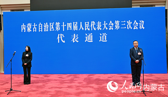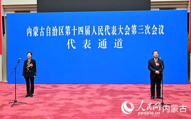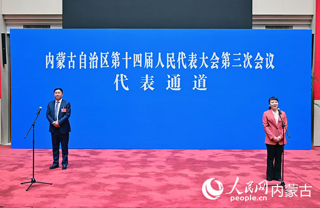 自治区代表,自治区农牧业科学院院长和远(左)和自治区代表,兴安盟阿尔山市明水河镇党委、党群办事核心从任祁学东(左)正在代表通道上分享履职故事。人平易近网记者 刘艺琳摄。