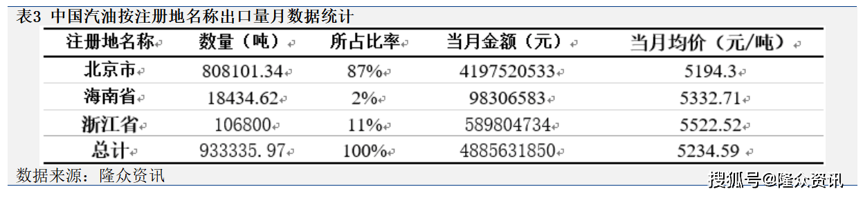 2025年3月,中国汽油出口量按注册地名称统计,排名前三位的为:市、浙江省、海南省。这三个省市合计出口量为93。3万吨,此中市占比达87%。
