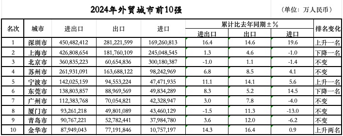 比宁波更猛的是正在2023年排名第二的深圳,凭仗16。4%的增速跃升至2024年的全国外贸“冠军”。