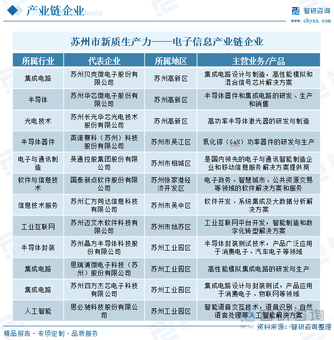 目前,姑苏曾经构成了较为完美的财产生态和强大的企业集群。姑苏市电子消息财产链中,具有多家实力雄厚的上市公司,如晶方科技、思瑞浦、长光华芯、英诺赛科等。这些公司正在各自的细分范畴内具有显著的手艺劣势和市场份额,是姑苏市电子消息财产成长的中坚力量。