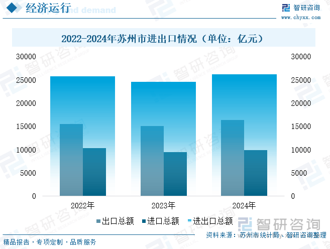 从进出口商业环境看,2024年姑苏市对外商业实现稳量提质,机电产物成为拉动增加的次要动力。全市实现进出口总额26193。1亿元,同比增加6。8%。此中,出口额16368。8亿元,增加8。5%;进口额9824。3亿元,增加4。1%。平易近营企业取外资企业配合发力,成为姑苏外贸增加的主要支持。2024年,平易近营企业实现进出口额10346。4亿元,同比增加6。9%;外资企业实现进出口额14818。9亿元,同比增加7。7%,两者配合鞭策了全市外贸的稳步增加。同时,新兴市场表示亮眼,成为姑苏外贸增加的新引擎。2024年,姑苏对共建“一带一”国度进出口额达10741。4亿元,同比增加11。8%,此中对东盟进出口额增加10。2%,显示出姑苏正在拓展新兴市场方面的显著成效。从产物看,机电产物出口增势强劲,成为姑苏外贸的焦点合作力。2024年,机电产物进出口额19830。0亿元,同比增加9。0%,占全市进出口总额的比沉提拔至75。7%,较上年提高1。5个百分点,进一步巩固了机电产物正在姑苏外贸中的从导地位。